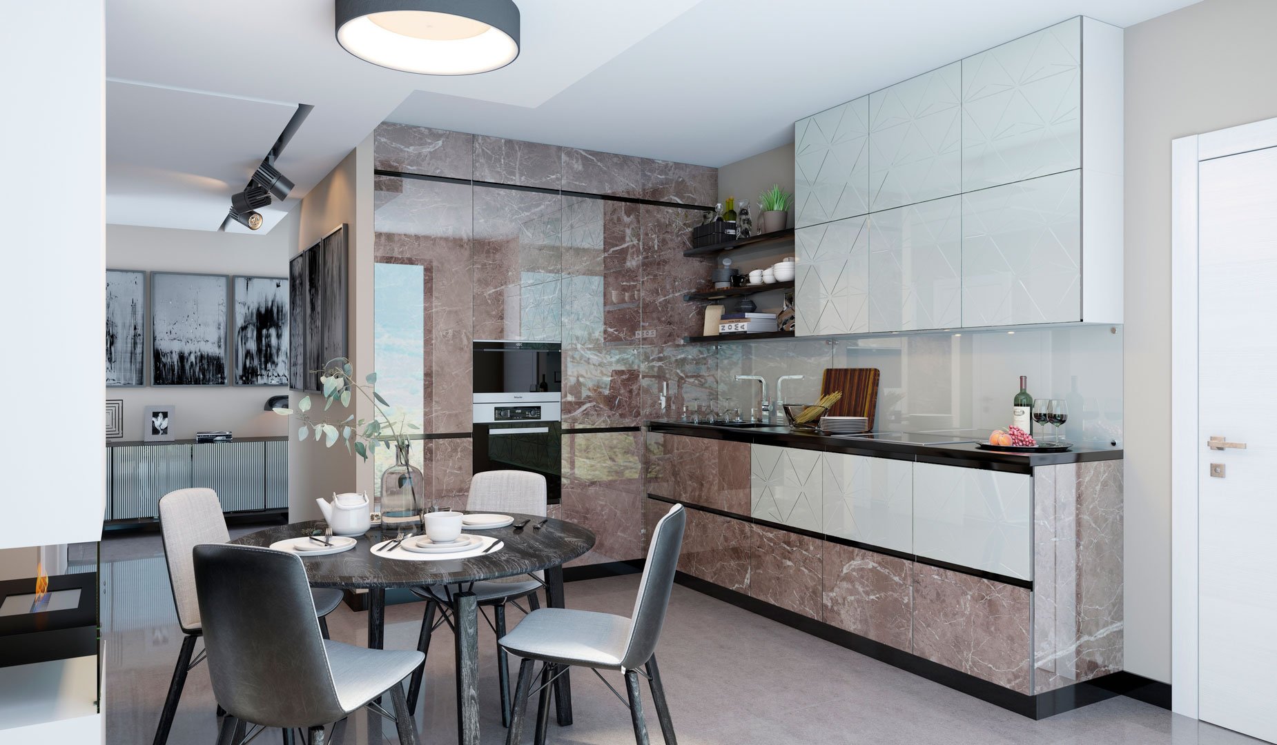 Блестящее и в то же время скромное решение для кухни. Здесь есть чем любоваться: естественный «мраморный» узор на фасаде дополнен тонким геометрическим орнаментом, сияющие поверхности мягко отражают свет,