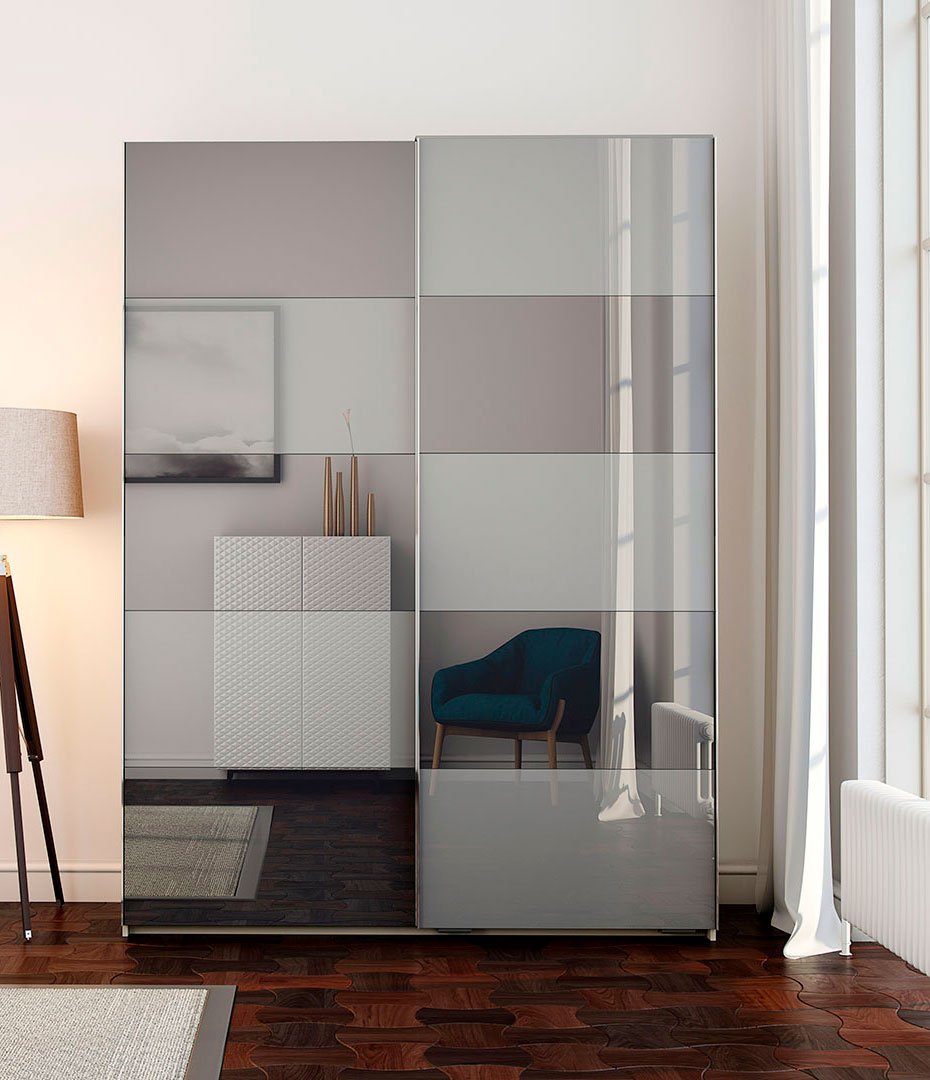 При оформлении фасадов шкафа-купе зеркала пользуются широкой популярностью. И это очень легко объяснить – в небольшом помещении они работают на зрительное «расширение» пространства и за счет отражения способны дополнительно «подсветить» комнату с недостаточной освещенностью.