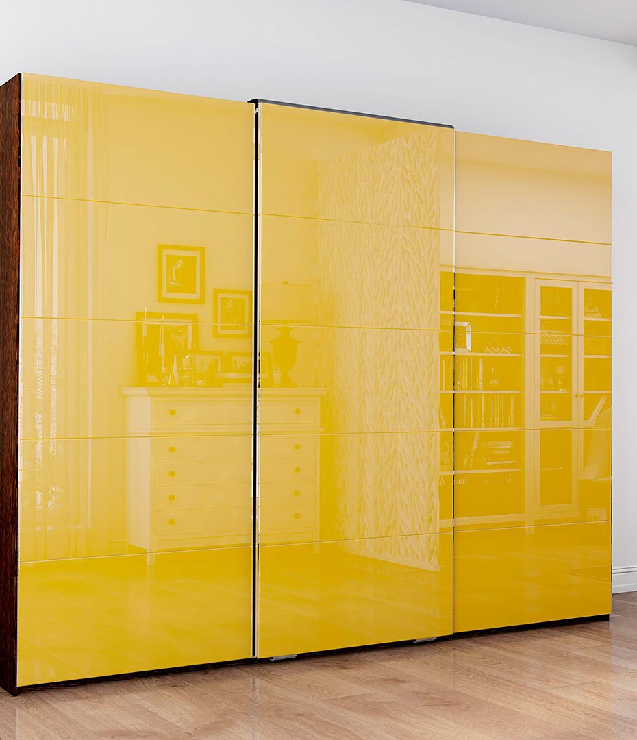 Фасады, изготовленные с применением цветной пленки, отличный элемент отделки дверей шкафов-купе. Специальная декоративная пленка наносится на обратную сторону стекла. А с лицевой стороны можно нанести витраж, пескоструйный рисунок, фотопечать или шелкографию. Также это стекло допустимо комбинировать с различными материалами, а также использовать в фасадах с криволинейными разделителями. Преимущества использования пленки очевидны: материалы в её составе экологичны, не горючи и не токсичны. Она не растягивается, не дает усадки, устойчива к выгоранию и на протяжении всего срока эксплуатации не меняет своих свойств. В закрытом помещении срок эксплуатации стекла, тонированного пленкой, не ограничен. Такой фасад неприхотлив в уходе: он легко очищается с помощью обычных моющих средств.