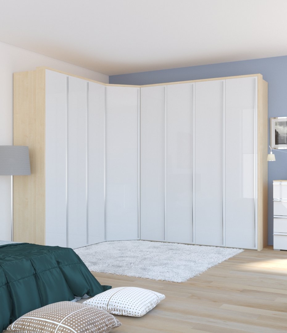 Светлые оттенки в отделке, гладкий фасад и ручки в тон — каждый элемент несет в себе маленькую миссию для одной большой цели. Мы расширяем пространство вашей спальни, создавая подобные модели угловых шкафов.