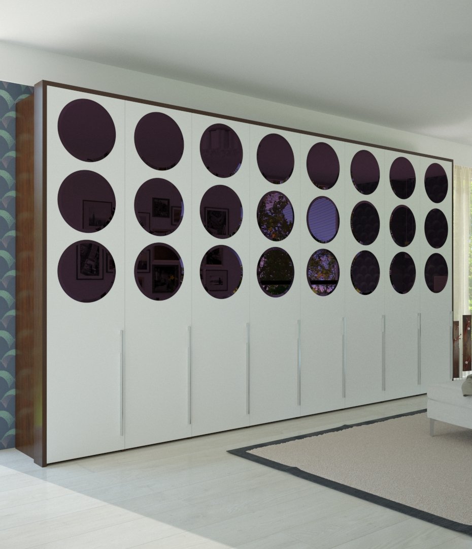 Этот вариант расположения фиолетовых зеркал заставляет нас вспомнить одновременно про море и космос. Интересное оформление шкафа для детской комнаты или спальни.