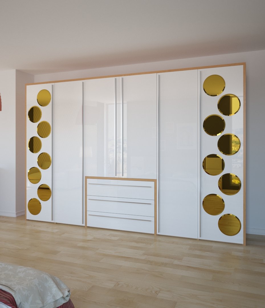 С сиянием белизны и золота снаружи, с четкой организацией пространства внутри — кому не понравится такой шкаф? Яркая модель впишется как в светлый интерьер, так и в комнату с темными стенами, создав выразительный контраст.