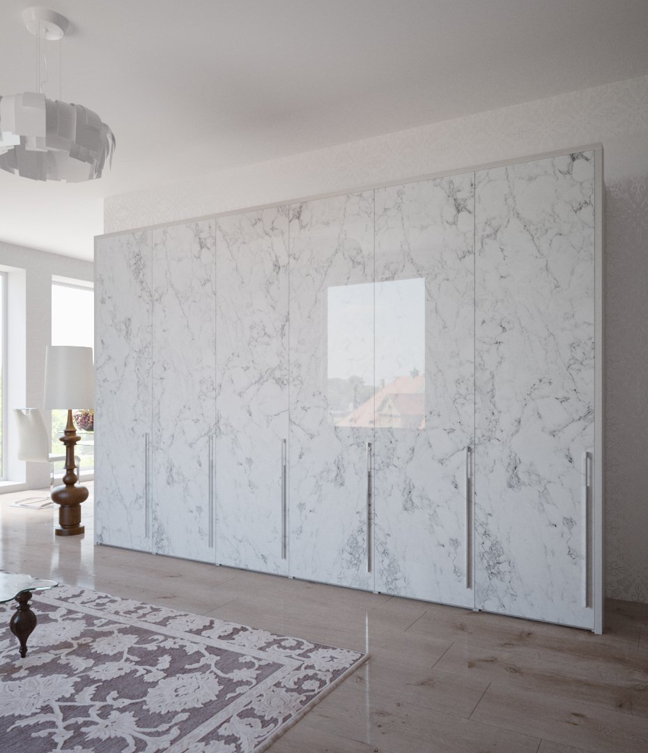 При оформлении фасадов шкафа-купе зеркала пользуются широкой популярностью. И это очень легко объяснить – в небольшом помещении они работают на зрительное «расширение» пространства и за счет отражения способны дополнительно «подсветить» комнату с недостаточной освещенностью.