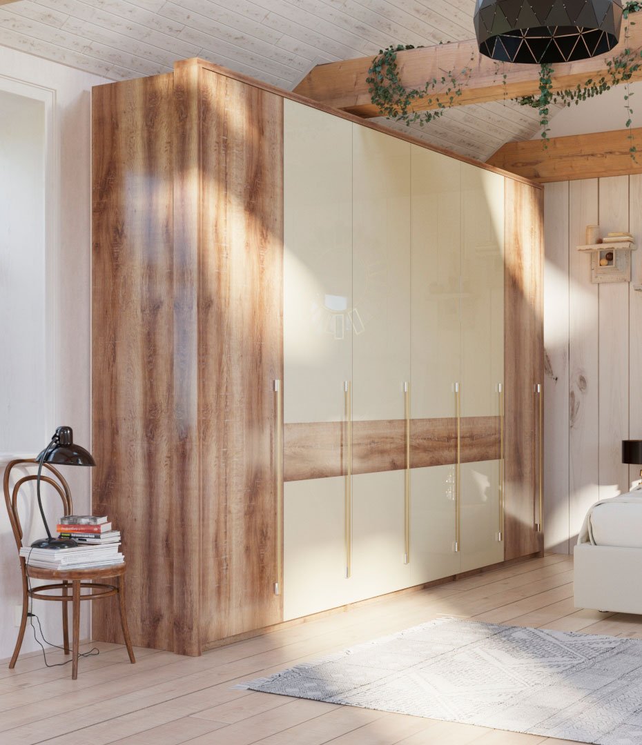 Скандинавский стиль — это не только белый цвет, но и теплые древесные тона, тонкие ручки дверок шкафа и глянцевое стекло его створок сливочного цвета. Модель, которая активно задает тон всей комнате.