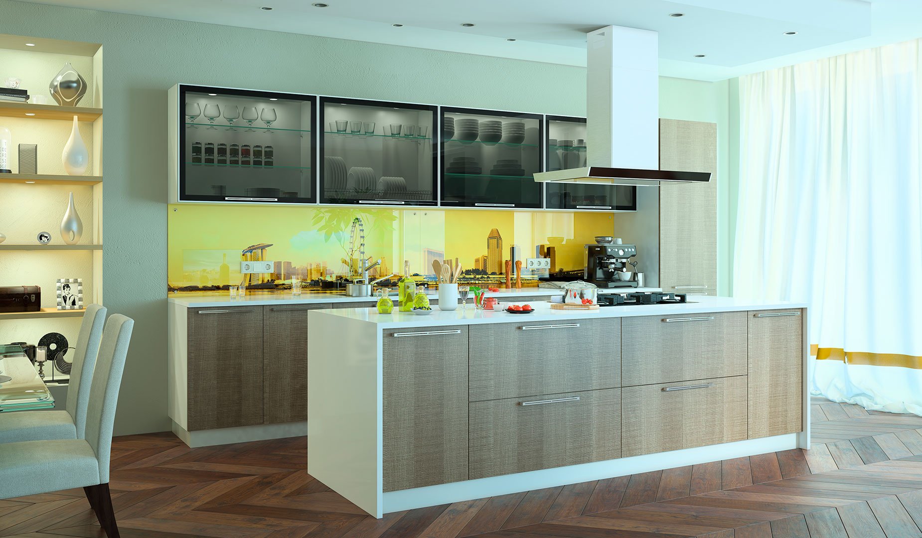 В гарнитуре с большим вкусом и гармонией сочетаются добротные панели цвета темного дерева, светлый корпус и затемненное стекло. Солнечная стеновая панель вносит в строгую обстановку теплые нотки. «Санта» бережет традиции, но успевает следить за модой. Если вы привыкли к комфорту, без сомнений выбирайте эту модель — вам понравится и продуманная конструкция, и простор внутри шкафчиков, и простая «взрослая» роскошь. Еще один плюс в том, что такая мебель вряд ли когда-нибудь устареет.