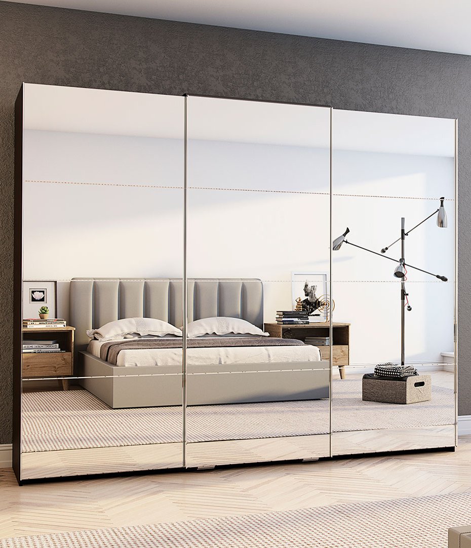 При оформлении фасадов шкафа-купе зеркала пользуются широкой популярностью. И это очень легко объяснить – в небольшом помещении они работают на зрительное «расширение» пространства и за счет отражения способны дополнительно «подсветить» комнату с недостаточной освещенностью.