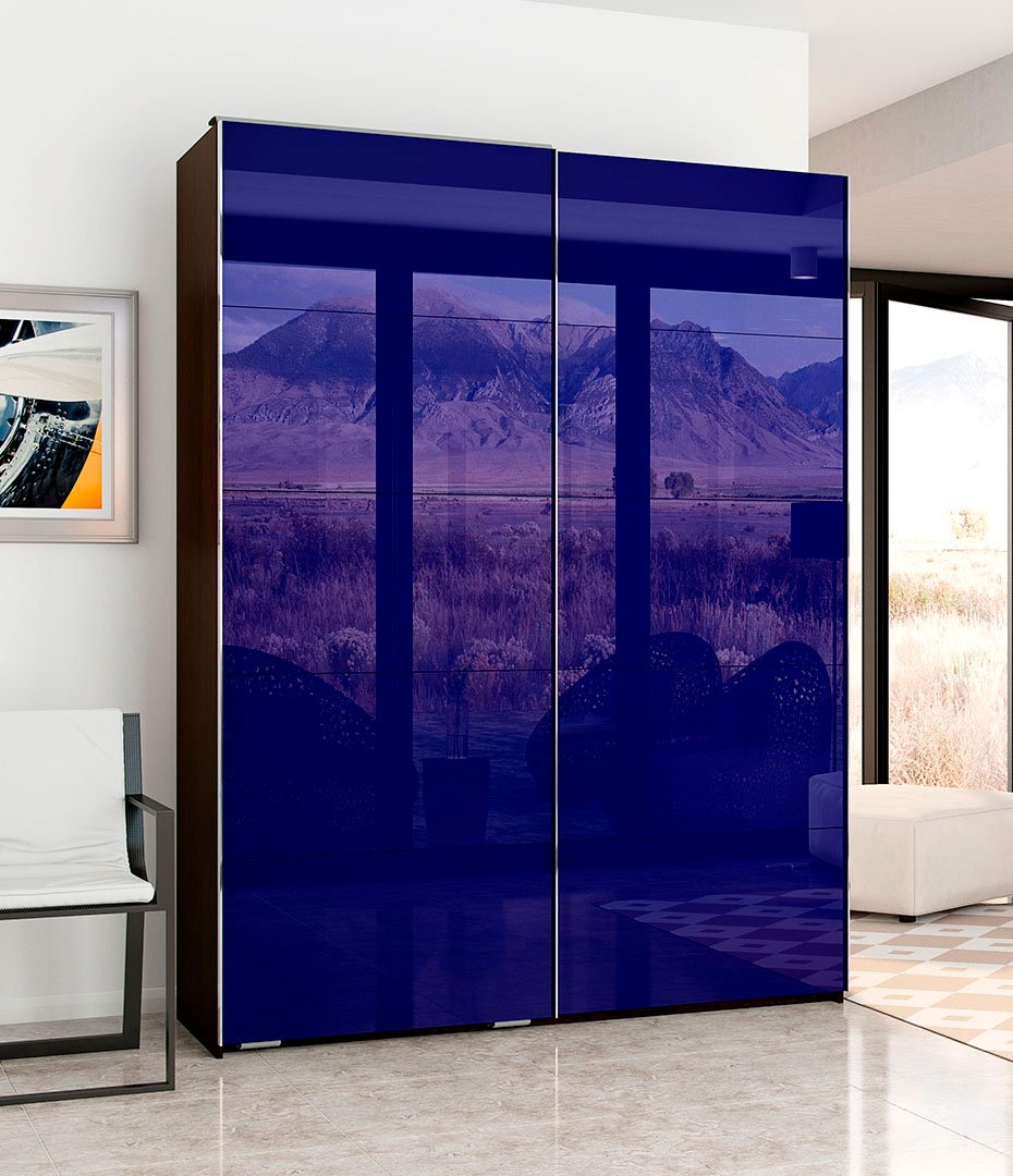 Фасады, изготовленные с применением цветной пленки, отличный элемент отделки дверей шкафов-купе. Специальная декоративная пленка наносится на обратную сторону стекла. А с лицевой стороны можно нанести витраж, пескоструйный рисунок, фотопечать или шелкографию. Также это стекло допустимо комбинировать с различными материалами, а также использовать в фасадах с криволинейными разделителями. Преимущества использования пленки очевидны: материалы в её составе экологичны, не горючи и не токсичны. Она не растягивается, не дает усадки, устойчива к выгоранию и на протяжении всего срока эксплуатации не меняет своих свойств. В закрытом помещении срок эксплуатации стекла, тонированного пленкой, не ограничен. Такой фасад неприхотлив в уходе: он легко очищается с помощью обычных моющих средств.