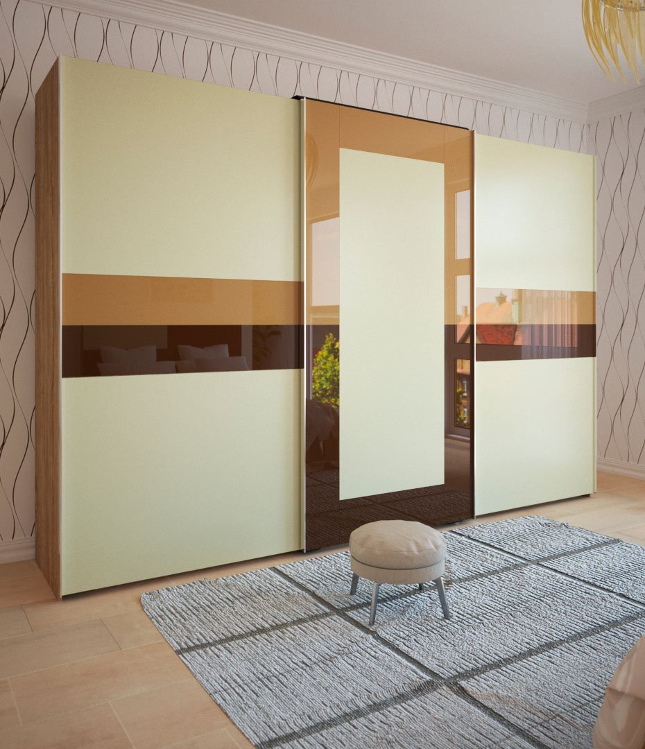 Фасады, изготовленные с применением цветной пленки, отличный элемент отделки дверей шкафов-купе. Специальная декоративная пленка наносится на обратную сторону стекла. А с лицевой стороны можно нанести витраж, пескоструйный рисунок, фотопечать или шелкографию. Также это стекло допустимо комбинировать с различными материалами, а также использовать в фасадах с криволинейными разделителями. Преимущества использования пленки очевидны: материалы в её составе экологичны, не горючи и не токсичны. Она не растягивается, не дает усадки, устойчива к выгоранию и на протяжении всего срока эксплуатации не меняет своих свойств. В закрытом помещении срок эксплуатации стекла, тонированного пленкой, не ограничен. Такой фасад неприхотлив в уходе: он легко очищается с помощью обычных моющих средств.