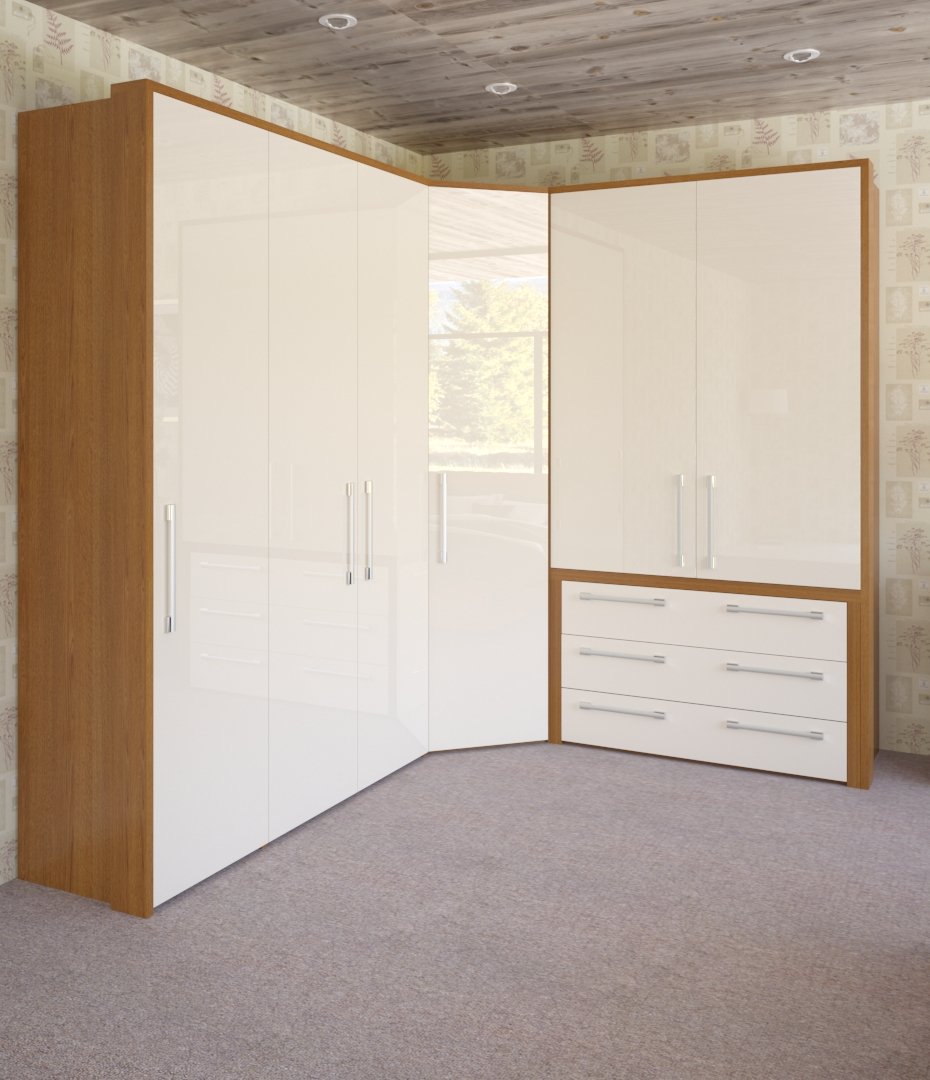Интересный вариант компоновки шкафа с распашными дверями и комода. В этой модели доступ к последнему не закрывается дополнительными створками. Однако этот вариант не портит дизайна мебели. Вариант с комодом можно дополнить зеркалом или открытыми полками. Все по желанию заказчика.