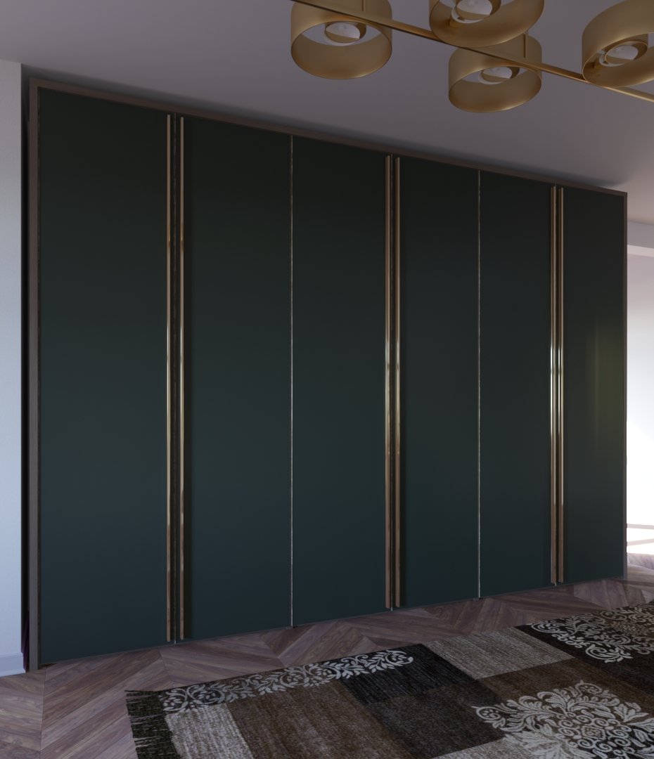 Вкус хозяев проявляется в грамотном использовании сложных цветов в интерьере. Редко встретишь модель шкафа, подобную этой. Распашные двери из матового стекла покрыты тонированной пленкой. Если кликнуть на ссылку «Посмотреть в интерьере», можно полюбоваться, как меняет комнату всего лишь интересный цвет шкафа и комода.